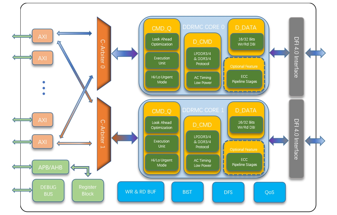 - Integration: DFI 4.0 compliant PHY, multiport AXI4 controller