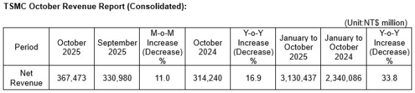 HSINCHU, Taiwan, R.O.C. – Nov. 10, 2025 - TSMC (TWSE: 2330, NYSE: TSM) today announced its net revenue for October 2025: On a consolidated basis, revenue for October 2025 was approximately NT$367.47 billion, an increase of 11.0 percent from September 2025 and an increase of 16.9 percent from October 2024. Revenue for January through October 2025 totaled NT$3,130.44 billion, an increase of 33.8 percent compared to the same period in 2024.