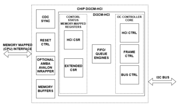 At up to 12.5 MHz operation, the DI3CM-HCI supports I3C SDR and HDR-DDR modes, while remaining fully backward compatible with I²C. Power efficiency is enhanced through optional clock gating, and throughput is optimized via configurable buffer sizes, programmable DAT/DCT structures, and a DMA handshake interface.