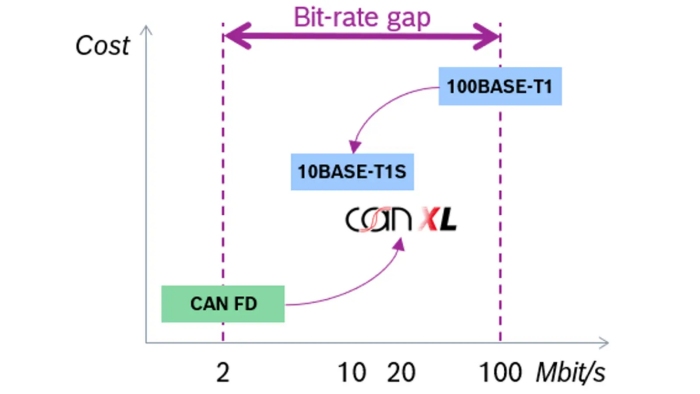 Figure 2: CAN XL was developed to bridge the performance gap between CAN FD and 100Base-T1 Ethernet.