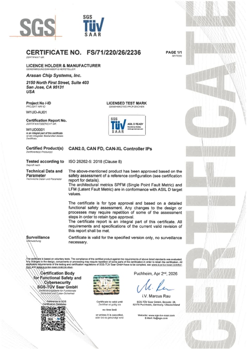 SAN JOSE, Calif.-- Arasan Chip Systems, the industry's leading provider of IP for Mobile and Automobile SoC's, announced today that its CAN XL IP has achieved the ASIL-D Certification. The CAN XL IP has been independently certified by SGS-TÜV Saar as ASIL-D, the highest safety level of functional safety defined in ISO 26262, the international standard for functional safety in road vehicles.