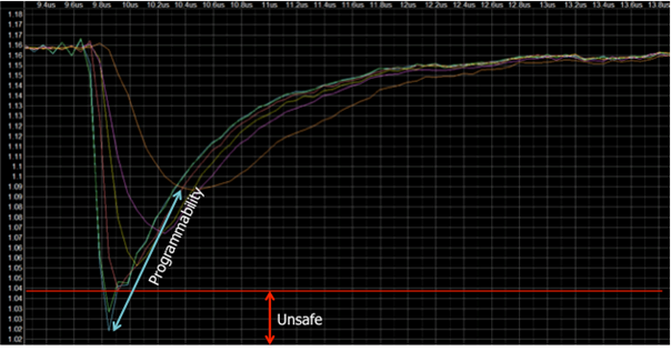 通过其获得专利的单元"转换斜坡控制器"(TRC,Transition Ramp Controller)CLICK可以自动限制浪涌(Inrush)电流,控制其导致的IR压降,优化电源域的唤醒时间。由于TRC的寄存器的可编程特性,即使在电路流片后,仍旧可以在安全限度内进行调节并使得唤醒时间与最大浪涌(Inrush)电流之间达到完美的平衡。而传统的菊花链(daisy chain)结构则不具备此控制方案的灵活性与安全性。